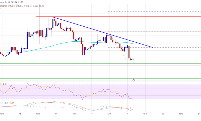 A low is shaped close to $1,542 and the worth is now consolidating losses. The present value motion suggests excessive probabilities of extra losses. There’s additionally a connecting bearish pattern line forming with resistance close to $1,565 on the hourly chart of ETH/USD.