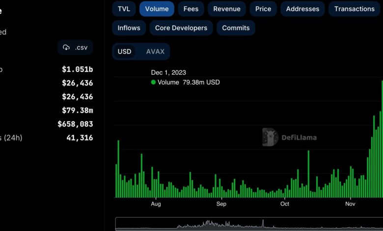 This was indicated by the rising volumes on the Avalanche community. In response to DefiLlama’s information, the quantity on Avalanche grew from 79.38 million to 218 million within the span of some weeks.