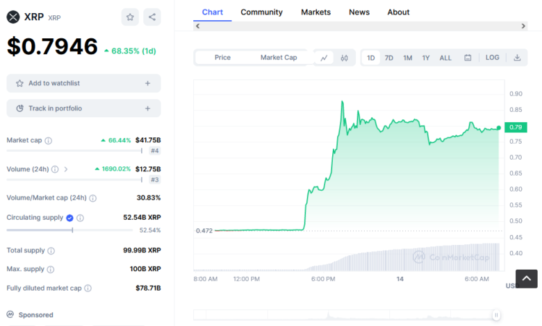 XRP is the most important gainer available on the market right now with a pump of 66% within the final 24 hours. Following its partial win within the ongoing authorized tussle with the SEC, the worth of XRP surged by virtually 74% reaching $0.8875. In keeping with CoinMarketCap updates, that’s the best worth of the asset YTD. Nonetheless, it encountered resistance on the $8 area and resettled at $0.7946, buying and selling sideways for many of the day.