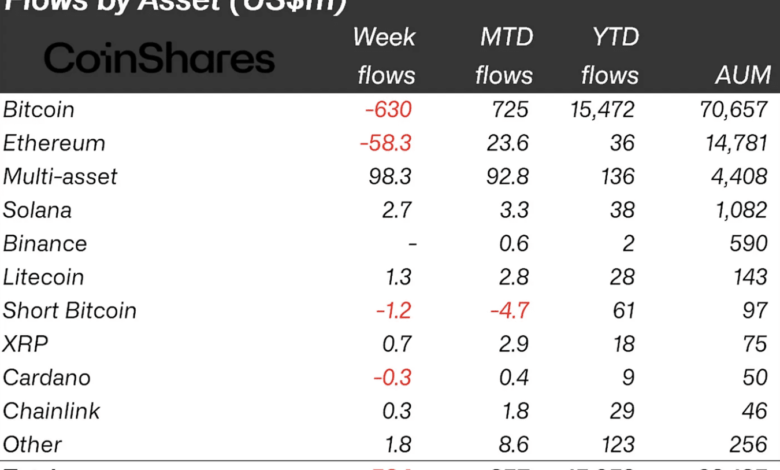 This introduced the overall outflows in two weeks to $1.2 billion. As anticipated, Bitcoin [BTC] had the very best outflows with$630 million. The report defined that the gloomy notion amongst buyers and projected rate of interest minimize contributed to the capital move.