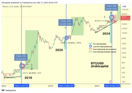 Based on Rekt Capital, there often is a pre-halving rally roughly 60 days earlier than the occasion takes place. For the ultimate pre-halving retrace, it often develops round 14 to twenty-eight days forward.