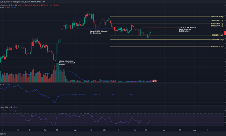 To sign a bullish shift within the construction, Bitcoin costs should rise again above the latest decrease excessive at $27.4k. But, an uptrend wouldn’t be established there, as BTC would want to kind the next low and proceed larger. Cautious traders can await this flip of occasions earlier than seeking to purchase.