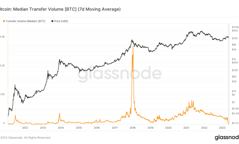 - Bitcoin’s median switch quantity has not too long ago reached a file low.