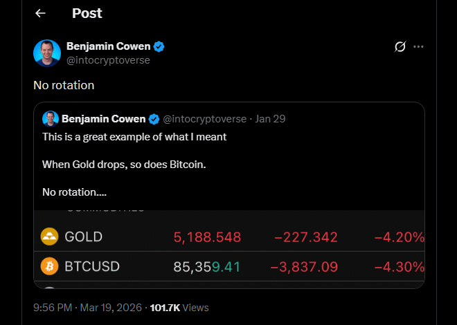 Benjamin Cowen, CEO of Into The Cryptoverse, says no. He has held that view since not less than late January, when gold was nonetheless using excessive and crypto bulls had been relying on a rotation commerce. He didn’t purchase it then. He nonetheless doesn’t.