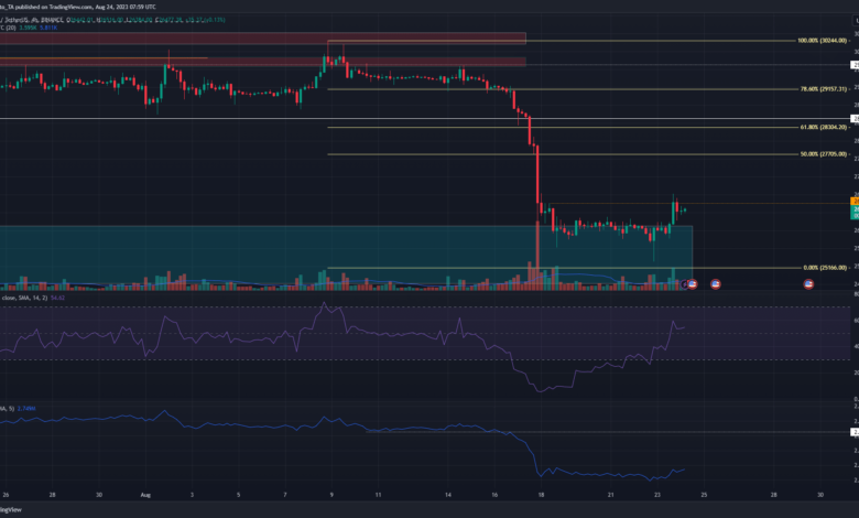 The Fibonacci retracement ranges (yellow) have been plotted primarily based on the free-fall that BTC noticed final week. It confirmed that the $28.3k and $29.1k ranges might be examined as resistance. The $28.5k stage was vital as properly.