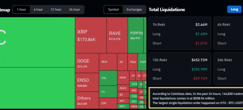 Based on CoinGlass, greater than 144,839 merchants had been liquidated within the final 24 hours, with complete liquidations of over $508 million and about 92% tied to lengthy bets.