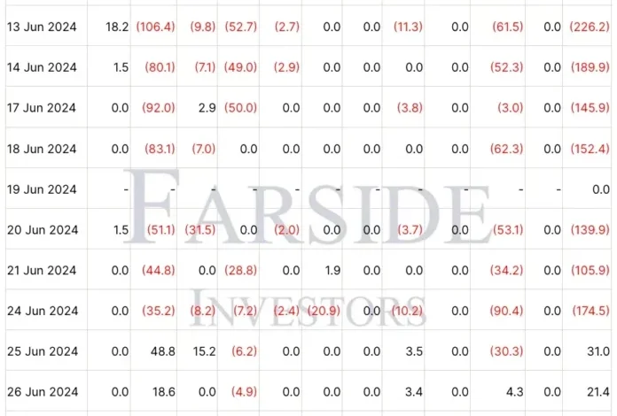 Actually, information from Farside Investors revealed that this was the case throughout most Bitcoin ETFs in June. At press time, Grayscale Bitcoin Belief (GBTC) led the pack with almost $559 million in outflows since 10 June.