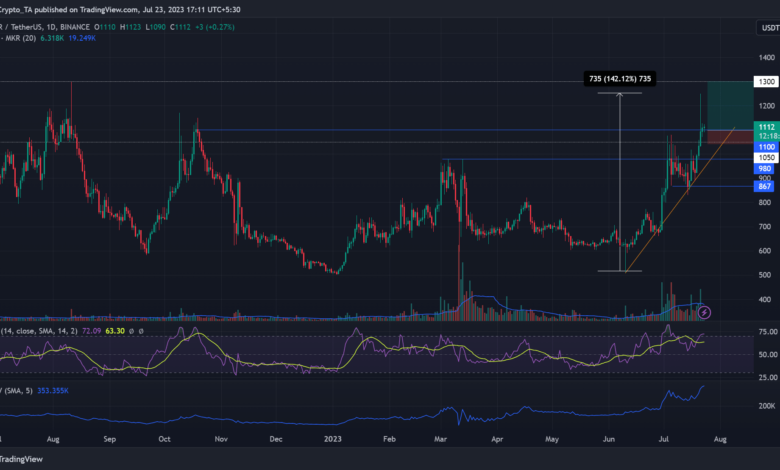 MKR’s rally previously few weeks tipped it to clear the earlier 2023 excessive of $980. Nevertheless, the value motion retraces to the November 2022 degree of $1100. Apart from, throughout slight pullbacks, the restoration has rebounded from a key ascending trendline help (orange).