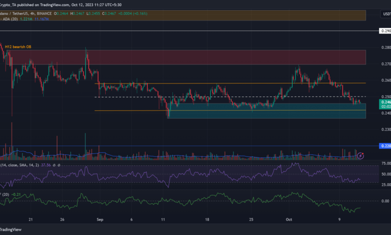 AMBCrypto’s ADA’s value prediction on 10 October accurately projected a drop to the confluence of the range-low and D1 bullish order block (OB) at $0.24. However a rebound was elusive on the bullish zone at press time.