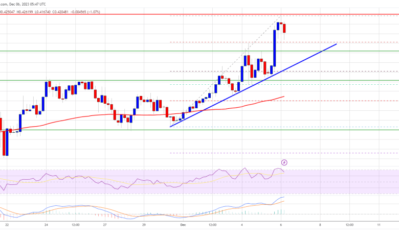 The worth even climbed above the $0.420 resistance. A excessive was fashioned close to $0.4293 and the value is now consolidating positive factors. It’s buying and selling above the 23.3% Fib retracement degree of the upward transfer from the $0.3715 swing low to the $0.4293 excessive.