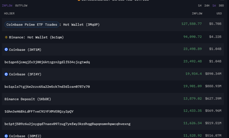 Coinbase Prime hot wallet leads weekly Bitcoin trading with $11.4 billion volume