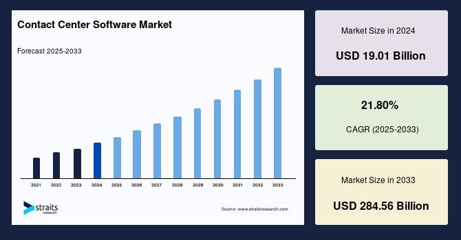 In keeping with Straits Analysis, the contact heart software program market dimension was valued at USD 19.01 billion in 2024 and is projected to succeed in USD 284.56 billion by 2033, rising at a CAGR of 21.80% through the forecast interval (2025-2033). The market is pushed by AI-powered automation, cloud adoption, and omnichannel methods that improve effectivity, personalization, and seamless buyer interactions.