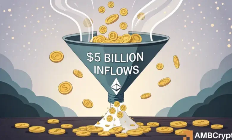 • Ethereum ETFs entice over $5 billion in inflows, signaling rising institutional confidence