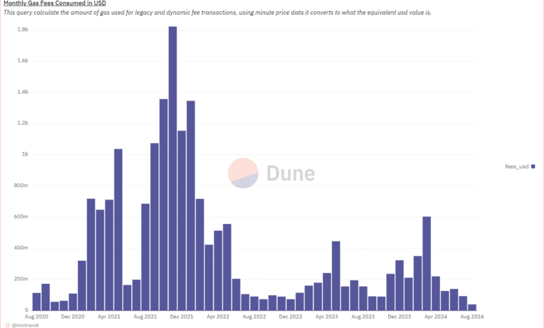 In response to Dune Analytics, March 2024 was the final time Ethereum’s gasoline charges noticed a major spike, reaching over $603.2 million.