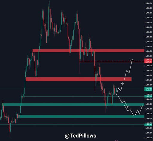 Nonetheless, Ted additionally outlined the chance situation. A failure to interrupt above the $3,300–$3,400 zone may consequence within the asset turning again down for an additional retest of the foundational $3,000 zone.