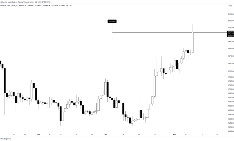 Bitcoin’s worth has climbed over 100% in 2023, however Ether has since lagged behind. All that could possibly be altering now that ETHUSD broke above $2,000 and is now closing in on breaking apart out of an ascending triangle sample.