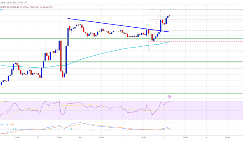 There was a transparent transfer above the $1,920 resistance zone. Moreover, there was a break above a key bearish development line with resistance close to $1,925 on the hourly chart of ETH/USD. The worth even traded to a brand new multi-day excessive at $1,960 and is at the moment consolidating good points.