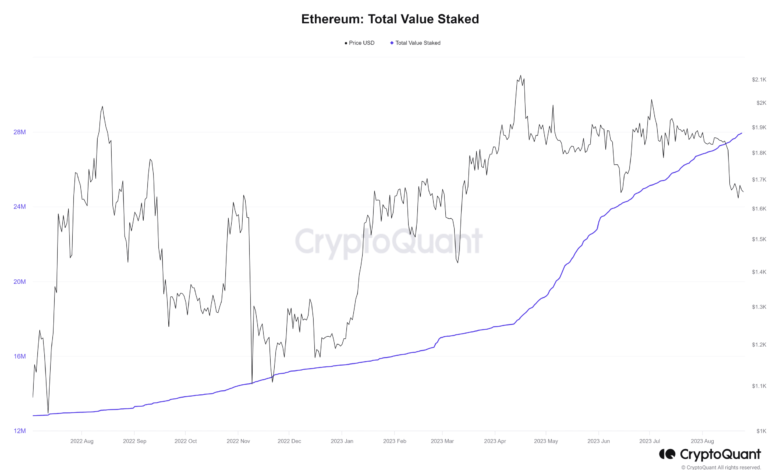 Latest knowledge from CryptoQuant indicated a gradual upward trajectory in Ethereum’s whole staked worth. As of this writing, almost 28 million ETH had been staked, in sharp distinction to the roughly 16 million ETH staked in January. This signified a considerable improve in staking quantity.