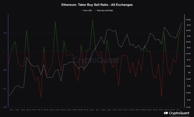 In line with AMBCrypto’s evaluation of CryptoQuant’s knowledge, Ethereum’s Taker Purchase Promote Ratio stormed into the inexperienced territory as indicated beneath.