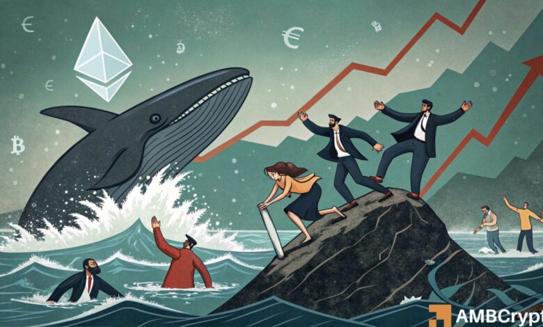 Earlier than this, ETH had been on an upward trajectory, mountain climbing 3% over the previous week and holding above the 20-day EMA. With Ethereum failing to maintain the uptrend, some traders, particularly whales, have capitulated.