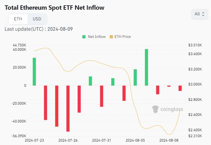 Bitcoin ETFs netflows averaged virtually 300,000 BTC within the final 2 weeks, in line with Coinglass. In the meantime, Ethereum had a complete spot ETF netflow of -114,350 ETH.