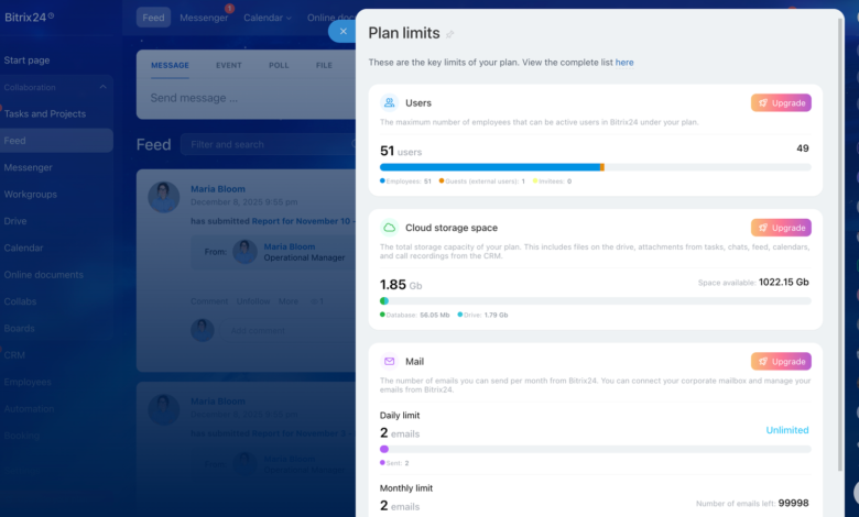 Sudden system limits can decelerate a enterprise. Emails won’t attain purchasers, recordsdata might fail to add, or storage might run out on the worst attainable second. These disruptions price time, focus, and momentum. Bitrix24’s updated Subscription section offers directors an on the spot view of storage, electronic mail utilization, consumer entry, and plan particulars, so potential points could be noticed and dealt with earlier than they have an effect on each day operations.