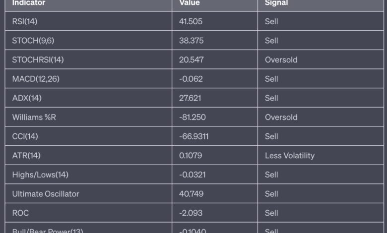 • MACD(12,26): The Transferring Common Convergence Divergence is -0.062, indicating a promote place. This means that the short-term momentum is leaning towards the sellers. The MACD is a trend-following momentum indicator that exhibits the connection between two transferring averages of a safety’s value.