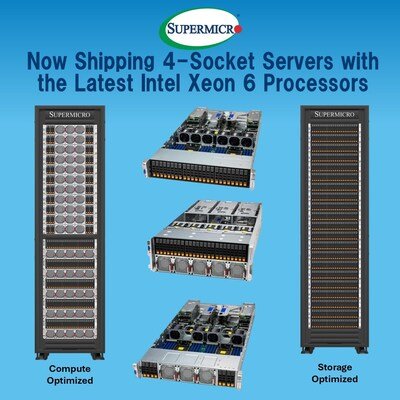 SAN JOSE, Calif., July 16, 2025 /PRNewswire/ — Tremendous Micro Pc, Inc. (SMCI), a Complete IT Resolution Supplier for AI/ML, HPC, Cloud, Storage, and 5G/Edge, is now delivery the business’s most superior 4-socket servers for large-scale database and enterprise functions. Utilizing the newest Intel Xeon 6 Processors with Efficiency-Cores (P-Cores), these new servers are CXL 2.0 prepared and are perfect for HPC, mission-critical workloads, and in-memory databases. Different functions that may profit from these methods are those who require a really giant reminiscence footprint with huge processing energy, or scientific simulation functions that rely closely on CPU computing with low latencies. As a important element of Supermicro’s Knowledge Heart Constructing Block Options® (DCBBS), these new servers supply considerably greater efficiency than earlier generations of 4-socket methods.