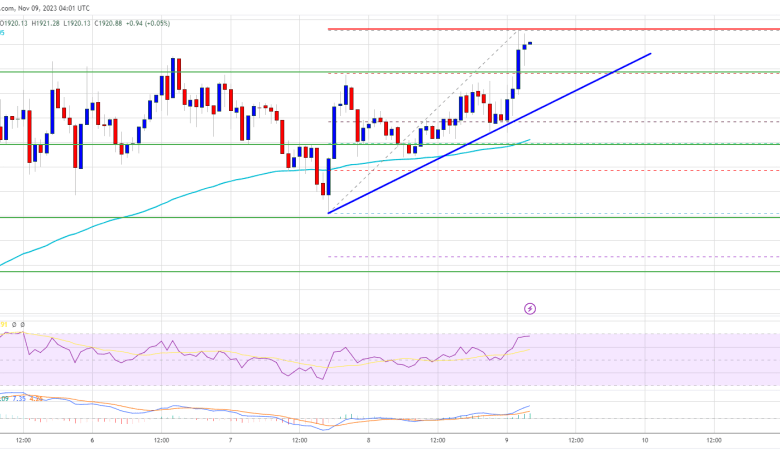 There was additionally a transfer above the $1,920 resistance. The value traded to a brand new multi-week excessive at $1,925 and is presently consolidating beneficial properties. The present worth motion is optimistic above the 23.6% Fib retracement degree of the latest wave from the $1,852 swing low to the $1,925 excessive.