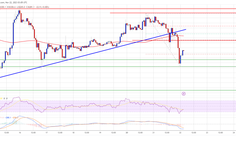 There was a pointy decline under the $37,000 degree. There was a break under a key bullish pattern line with help close to $36,980 on the hourly chart of the BTC/USD pair. The pair even broke the $36,500 help zone. Lastly, it spiked under the $36,000 degree.
