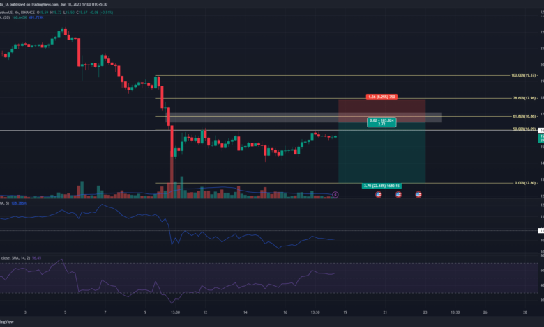 The FVG on the $16.8 area (highlighted by the white field) had confluence with the 61.8% retracement degree at $16.86. A check of this degree or the imbalance itself can present a dangerous shorting alternative for SOL bears, concentrating on the low at $12.8.