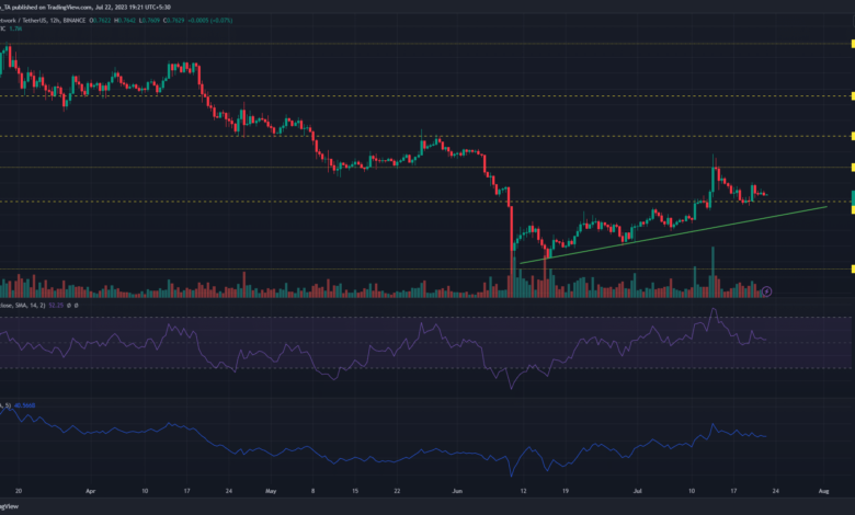 A bearish retest of the $0.7414 assist degree may see an aggressive dip to the $0.6000 – $0.6500 territory. Nevertheless, bulls have a double-layer protection within the assist degree and a bullish trendline. A break under this bullish confluence would sign a transparent shift in momentum.