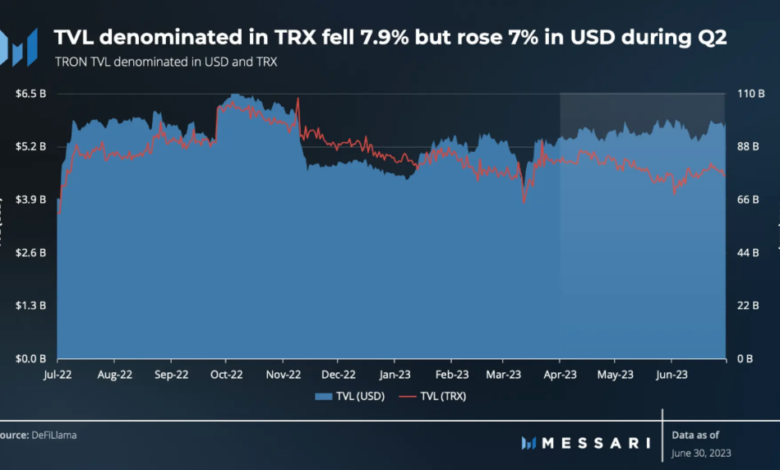 Throughout the community, TVl grew 7% when denominated in {dollars}, however the underlying quantity of TRX fell by 7.9%.