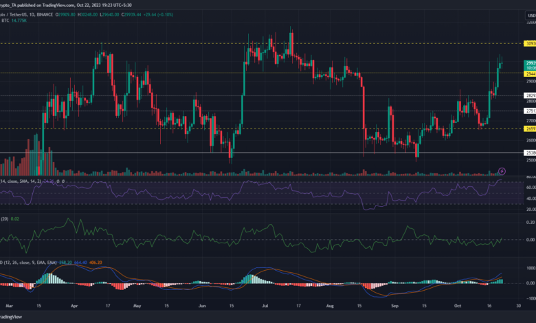 Bitcoin’s [BTC] outstanding week-long pump prolonged previous the $29.4k resistance stage, as bulls ramped up the shopping for stress. The bullish rally started on 15 October and as of press time, BTC registered 11.4% features, rising from $26.8k to $29.9k.