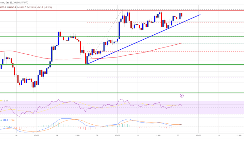It examined the $44,300 resistance zone. A excessive was shaped close to $44,300 and the value is now consolidating good points. The value corrected a couple of factors under the $44,100 stage. Nevertheless, it’s secure above the 23.6% Fib retracement stage of the upward transfer from the $41,820 swing low to the $44,300 excessive.