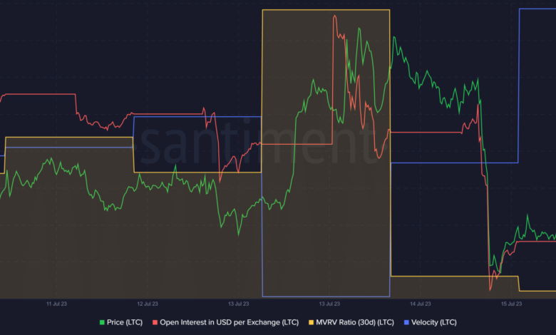 After an uptick, LTC’s MVRV Ratio plummeted sharply, which could have performed a task in not permitting the coin’s value to go up. Litecoin’s open curiosity began to rise when its value took a sideways path since 15 July. This urged that the present sluggish value motion would possibly proceed. Nonetheless, its velocity remained excessive, suggesting that LTC was used extra typically in transactions inside a set timeframe.