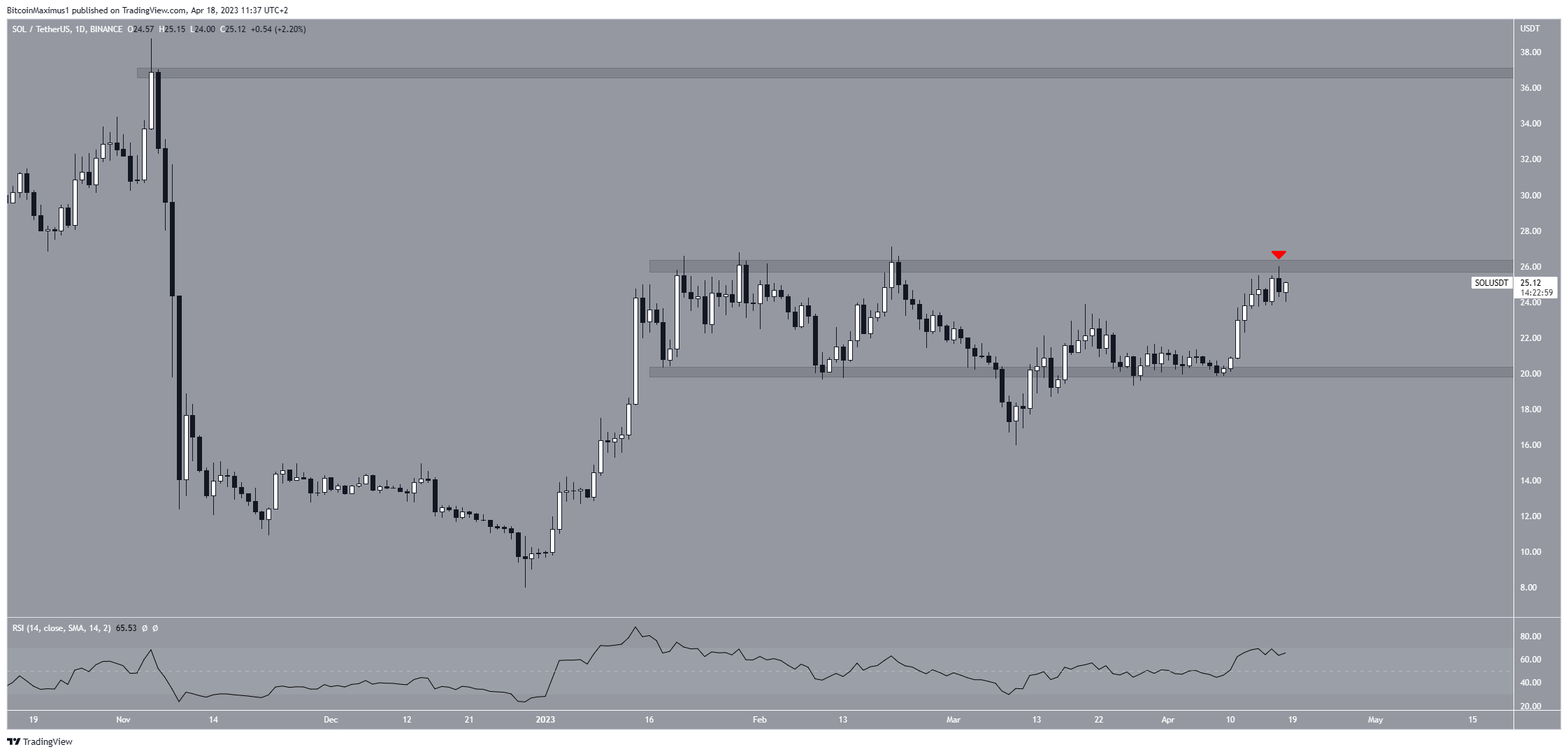 The technical evaluation from the day by day timeframe exhibits that the SOL token value is buying and selling in a spread between $20.50 and $26.00. The value reached a yearly excessive of $26.00 on April 16 however has decreased since. It created a bearish taking pictures star candlestick (pink icon) through the subsequent 24 hours.