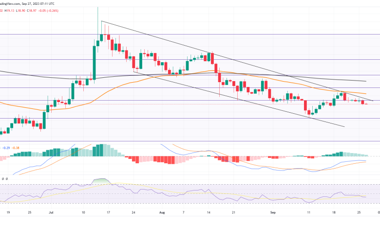 With the $19.45 breakdown, the subsequent credible and robust footing for the Solana coin worth is at $17.27. Presently buying and selling at $18.95 with an intraday fall of 0.37%, the bearish strain might quickly crash the altcoin.