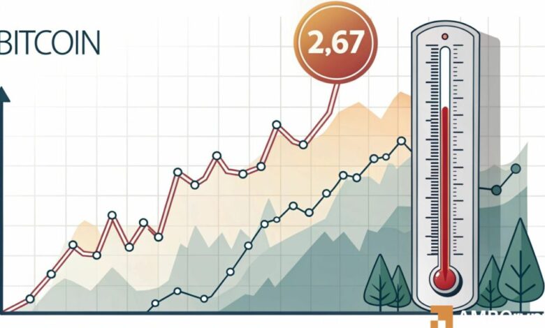 - Bitcoin’s worth temperature rises to 2.64 factors, approaching an overheated zone.